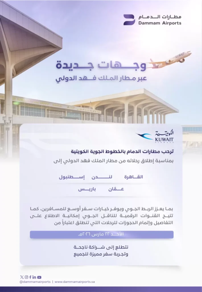 رحّبت مطارات الدمام بإطلاق الخطوط الجوية الكويتية رحلاتها من مطار الملك فهد الدولي إلى خمس وجهات دولية، شملت لندن، القاهرة، إسطنبول، عمّان، وباريس، وذلك اعتبارًا من يوم الأحد 22 مارس 2026.