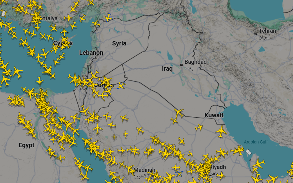 وتوضح الخريطة أن شركات الطيران العالمية والإقليمية قامت بإعادة توجيه مساراتها بعيداً عن مناطق التوتر، خصوصاً فوق العراق وسوريا، متجهة نحو مسارات بديلة عبر البحر الأحمر ومصر وشمال السعودية، ما أدى إلى تركز كبير في الحركة الجوية ضمن هذه الممرات.