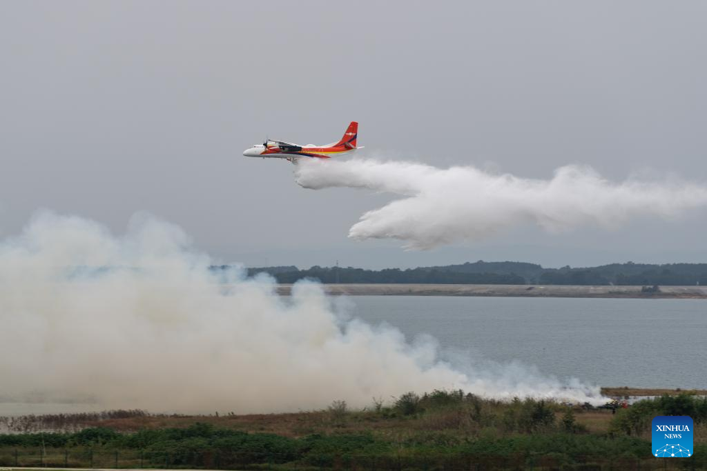 Air aviation news- The MA60 firefighting aircraft conducts the water drop over a simulated fire scene during an emergency rescue drill at the Zhanghe Airport in Jingmen, central China’s Hubei Province, Oct. 27, 2023. China’s independently-developed MA60 firefighting aircraft, a new member of the Modern Ark multipurpose aircraft family, is progressing forward on its airworthiness certification process, according to the Aviation Industry Corporation of China (AVIC). (Aviation Industry Corporation of China/Handout via Xinhua)