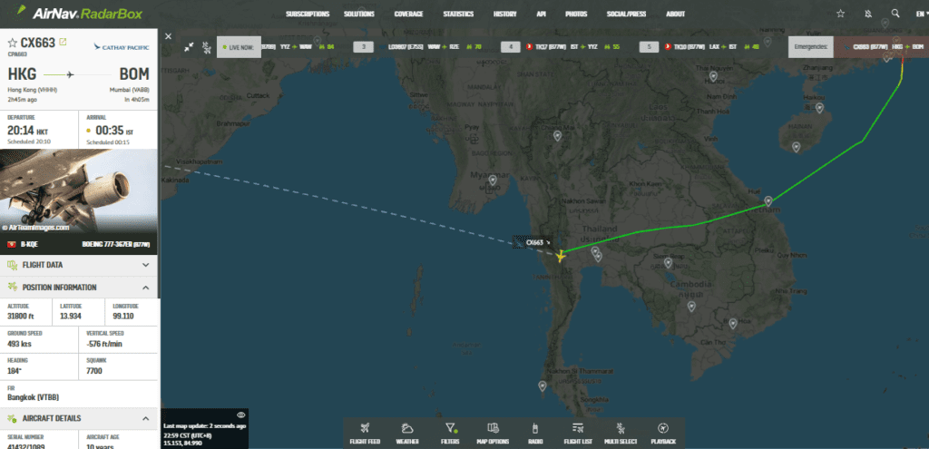 UPDATE #8 @ 1527 UK time – TOUCHDOWN! CX663 from Hong Kong to Mumbai has appeared to have landed safely into Bangkok following it’s emergency call a few moments ago resulting in this diversion. Standby for updates.