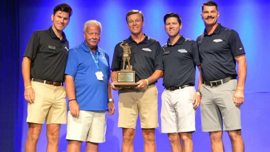 EAA Chairman and CEO Jack Pelton presented the award during a special ceremony to Aircraft Spruce CEO Jim Irwin, and other members of the family, including Jeff Irwin, Rob Irwin, and Mike Irwin.