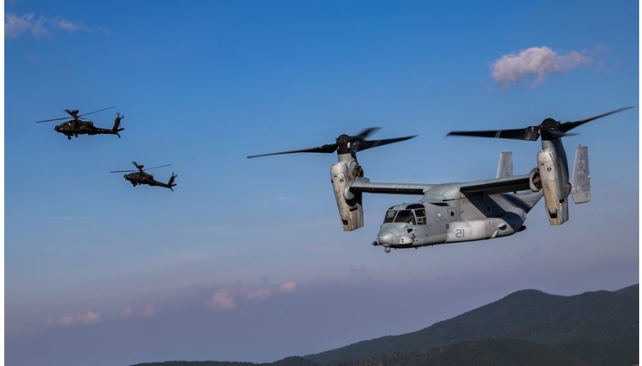 In partnership with 1st Marine Aircraft Wing’s Marine Medium Tiltrotor Squadron (VMM) 262, the Western Army Aviation Group and 1st Helicopter Brigade increased interoperability between the two nations by testing new tactics, and, for the first time, Japanese AH-64 Apache attack helicopters provided attached escort for a U.S. Marine Corps MV-22 Osprey tiltrotor aircraft while operating in the Hijyudai Range of Northern Kyushu.