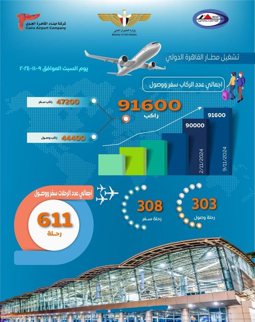 نشرت وزارة الطيران المدني المصرية إنفوجراف يوضح ارتفاعًا ملحوظًا في أعداد الركاب والرحلات الجوية حققها مطار القاهرة الدولي.