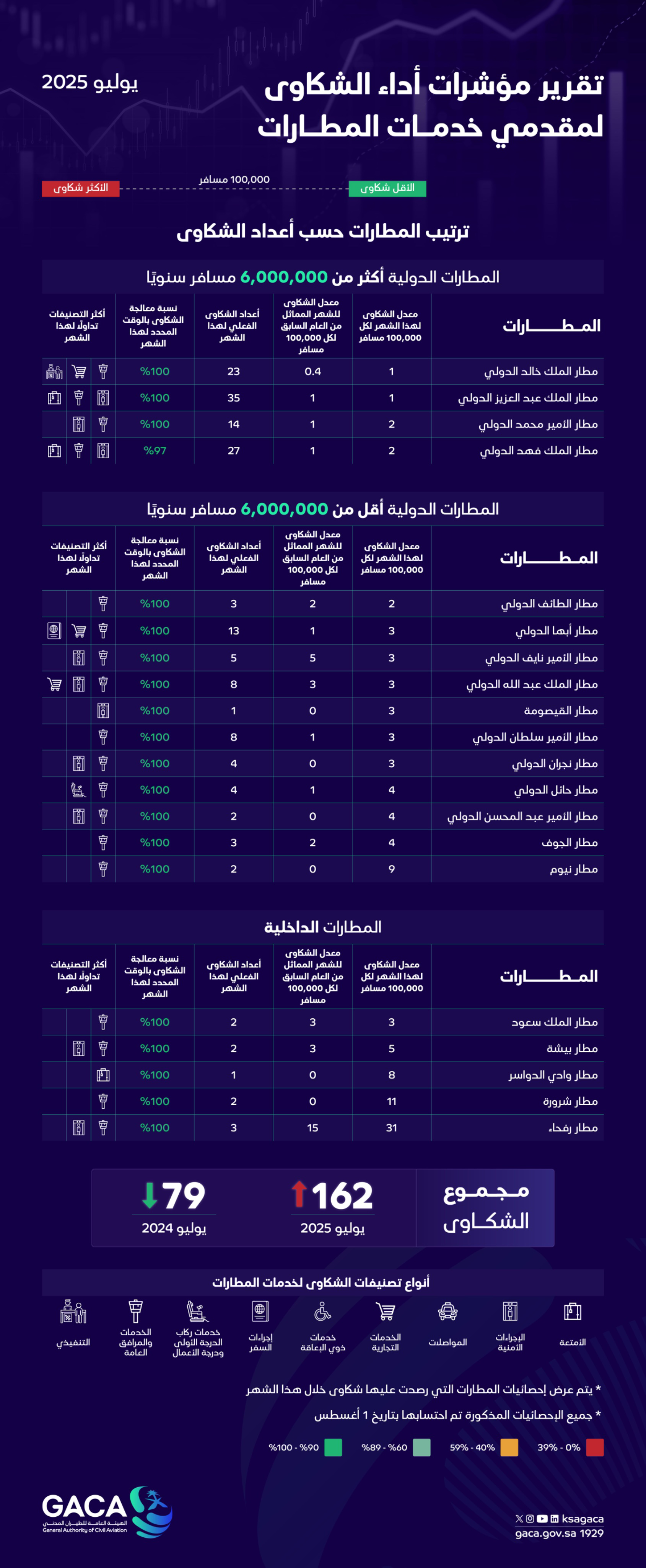 – حلَّ طيران ناس ثانيًا بواقع 36 شكوى لكل 100 ألف مسافر، وبنسبة معالجة للشكوى بالوقت المحدد إلى 100%.