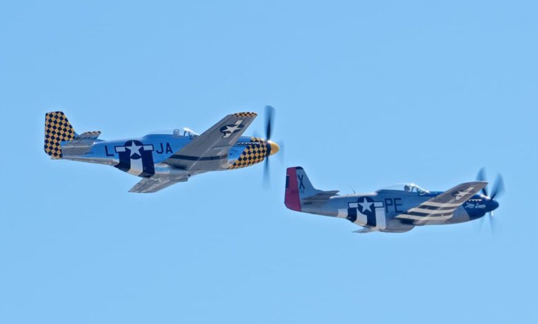 A pair of P-51 Mustang warbirds making one of several passes. Of the approximately 15,000 P-51s produced during WWII, about 150 airworthy examples of Mustangs exist worldwide.