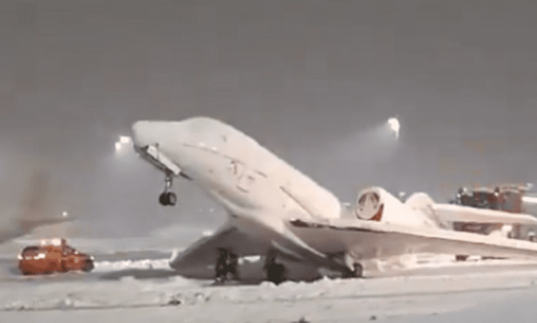 A video widely distributed via social media showed a Cessna Citation X stranded on the apron and tipped back on its tail. According to sources at local ground handlers, the incident was caused by heavy snow accumulating on the aircraft’s tail.
