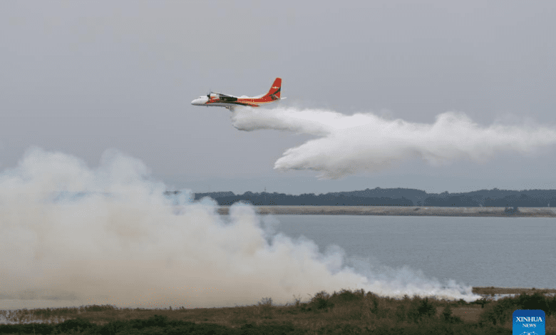 Air aviation news- The MA60 firefighting aircraft conducts the water drop over a simulated fire scene during an emergency rescue drill at the Zhanghe Airport in Jingmen, central China’s Hubei Province, Oct. 27, 2023. China’s independently-developed MA60 firefighting aircraft, a new member of the Modern Ark multipurpose aircraft family, is progressing forward on its airworthiness certification process, according to the Aviation Industry Corporation of China (AVIC). (Aviation Industry Corporation of China/Handout via Xinhua)