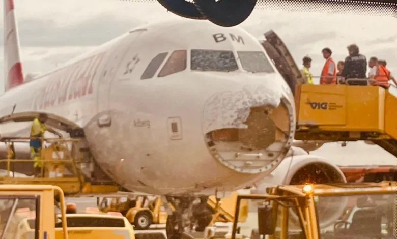 An Austrian Airlines plane has been seriously damaged, after it was caught up in an intense hailstorm during a flight on Sunday afternoon.