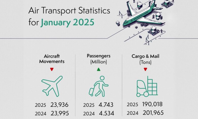 Preliminary Air Transport Statistics for the month of January 2025 indicated a slight decrease in aircraft movement of 0.2% compared to the same month last year. The number of passengers increased by 4.6% compared to January 2024.