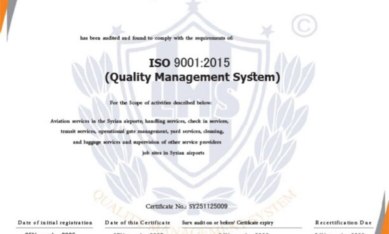The certification covers the company’s scope of work inside Syrian airports, including ground handling services, passenger check-in and departure services, transit assistance, operational gate management, ramp and cleaning services, baggage transport, and supervision of work sites for various service providers.