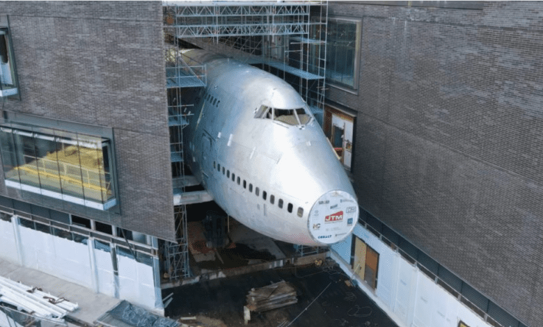 Boeing 747 Fuselage Suspended Between Seattle Towers in Striking Architectural Tribute