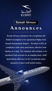 Kuwait Airways Announces Exceptional Resumption of Limited Flight Operations