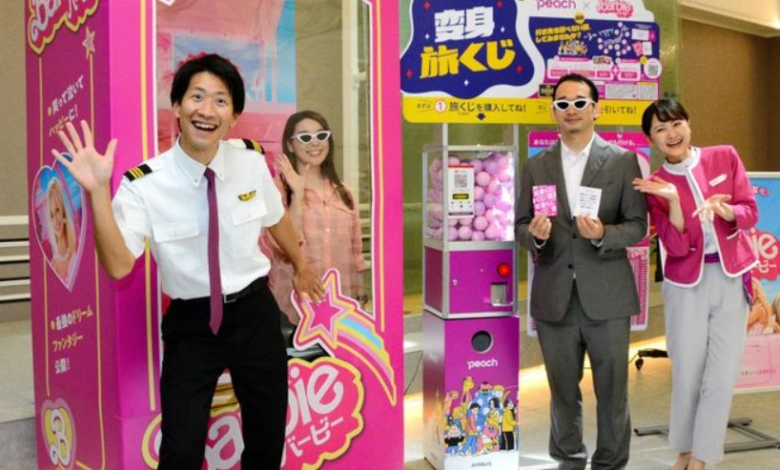 The man was attending a Peach Aviation news conference for the release of a collaborative campaign with a work of cinema. When asked to pose, the man waved as he smiled and fixed his gaze on the camera.