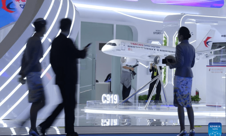 Air aviation news – This photo taken on Nov. 3, 2023 shows a model of China’s homegrown jet C919 displayed at the booth of China Eastern Airlines during an aviation industry event in Beijing, capital of China. The China Air Transport Association (CATA) hosts its first aviation conference from Nov. 3-5 in Beijing.